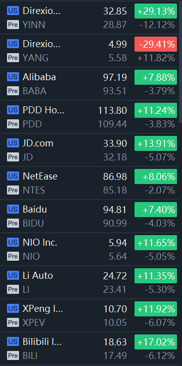 YINN fell 12%; Alibaba, PDD Holdings, and Baidu fell 4%; JD.com, NIO, and Li Auto fell 5%; XPeng and Bilibili fell 6%.