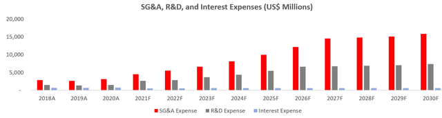 Cost of revenues as a percentage of total revenues are expected to improve slightly over time due to cost efficiencies achieved through economies of scale as Tesla’s vehicle and energy generation / storage solutions sales continue to ramp up. We are forecasting total cost of revenues to increase at a CAGR of 17% into 2030, which is in line with our revenue growth projections. This would accordingly result in projected cost of revenues of $34.9 billion by the end of the year and $116.5 billion by 2030, representing gross profit margin improvements from 21% in 2020 to approximately 25% by 2030 which is in line with guidance observed across industry peers such as Lucid Motors (NYSE: CCIV).