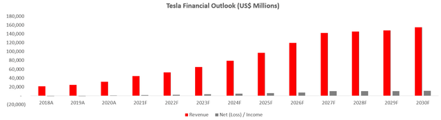 In order to evaluate the above-derived WACC’s impact on Tesla’s valuation, we have performed a 10-year discounted cash flow (“DCF”) analysis based on the company’s projected financials. The following will first briefly discuss the growth assumptions used in our projected financials for Tesla over the 10-year discrete period. Then, we will proceed to explain the inputs used in our DCF analysis and compute our valuation for Tesla.