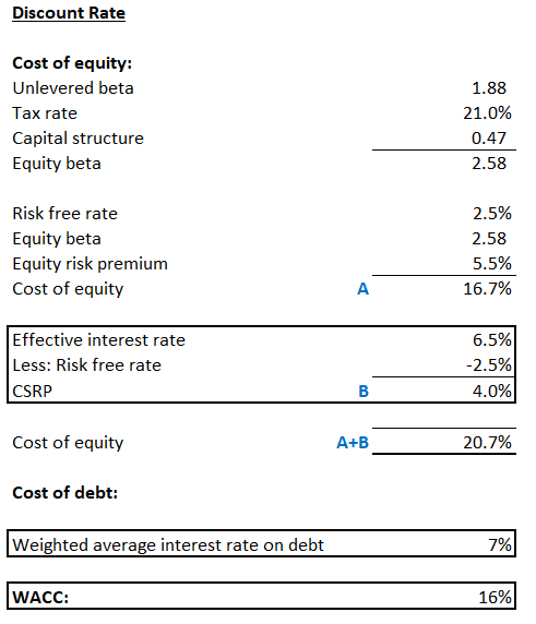 The upcoming rate hikes will also increase the weighted average cost of capital (“WACC”) used to discount the Tesla’s projected free cash flows, which will result in material changes to the company’s valuation. Considering the forecasted increase of Tesla’s effective interest rate on debt to 6.5% on a forward-looking basis and a risk-free rate of 2.5% based on projected 10-year Treasury yield post rate-hikes, Tesla’s company-specific risk premium (“CSRP”) used to compute the WACC would be approximately 4%. The weighted average cost of debt used to compute the WACC would also increase to approximately 7%. This would accordingly result in a WACC of 16% based on Tesla’s current debt-to-equity capital structure: