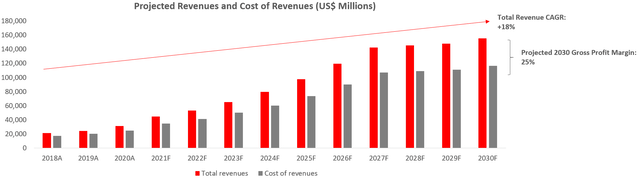 Based on the above growth trends observed across the EV sector, we are projecting revenues generated from the sale and leasing of Tesla vehicles to grow at a CAGR of approximately 20% into FY 2030; this is consistent with the company’s growing presence in the Chinese market, as well as the continuous ramp up in vehicle production and sales observed over the past year and in recent months. We are forecasting automotive revenues to increase by 43% year-over-year to approximately $38.9 billion by the end of 2021, and reach $149 billion by 2030 based on the 20% CAGR. And combined with the anticipated growth of ancillary revenues generated from Tesla’s energy and other services business segments, we are forecasting total revenues of $44.6 billion by the end of the year, and $155 billion by the end of the decade, representing a projected CAGR of 18% into 2030.