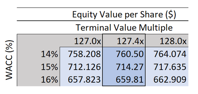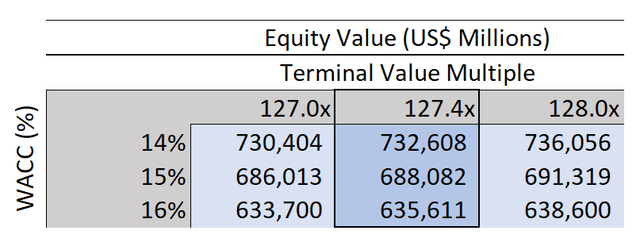 Holding the forecasted cash flow streams and exit multiple used in our DCF analysis above constant, a WACC of 14% would yield an equity value of approximately $732.6 billion, or $760.50 per share. This drives a difference in value of $97.0 billion, or $100.69 per share, compared to our valuation using a WACC of 16%. The difference accordingly represents the potential quantified impact that the upcoming rate hikes will have on Tesla’s intrinsic value.