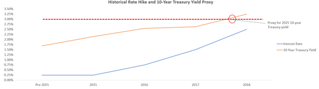 In order to forecast the new cost on Tesla’s future debt refinancing, we have used the historical rate hike trend observed between 2015 and 2018 as a proxy for the timing and extent of upcoming rate increases, and the related historical 10-year Treasury yields as a proxy for projected benchmark Treasury. On this basis, the projected 10-year Treasury yield could exceed 3% by 2025 following the upcoming rate increases.