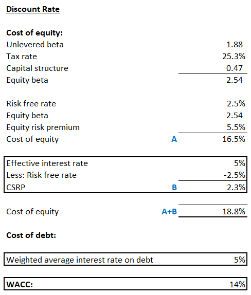 In order to quantify the potential impact of upcoming interest rate increases on Tesla’s valuation, we have also performed a sensitivity analysis using a WACC of 14% derived based on the company’s current effective interest rate of 5%.