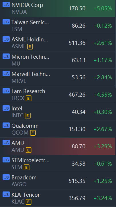 Semiconductor stocks climbed in morning trading. Nvidia, AMD, ASML, Micron, Lam Research, Marvell, Qualcomm and Broadcom climbed between 1% and 5%.