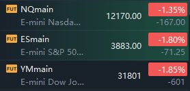 At 8:36 a.m. ET, Dow e-minis were down 601 points, or 1.85%, S&P 500 e-minis were down 71.25 points, or 1.80%, and Nasdaq 100 e-minis were down 167 points, or 1.35%.