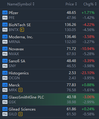 Novavax, Moderna, BioNTech, and Pfizer fell between 1% and 5%.