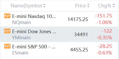 Nasdaq futures fell over 1%, S&P 500 futures were down 0.63%, Dow futures were down 0.35%.U.S. futures declined, pointing to more challenges for global shares after the Federal Reserve last week signaled sharp interest-rate hikes and balance-sheet reduction to curb price pressures.