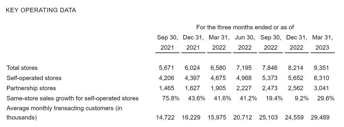 第一季度净新开店数为1137家。截至第一季度末,门店数量达9351家,包括6310家自营店和3041家加盟店。