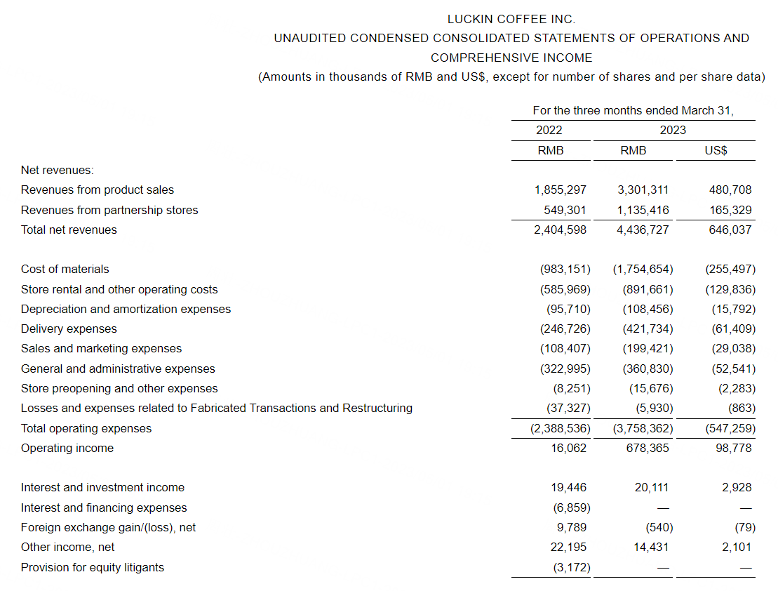 5月1日,瑞幸咖啡发布2023年第一季度业绩。财报显示,第一季度净营收44.37亿元,同比增长84.5%;净利润5.65亿元,上年同期为1983.5万元;每股盈利0.22元,上年同期为0.01元。
