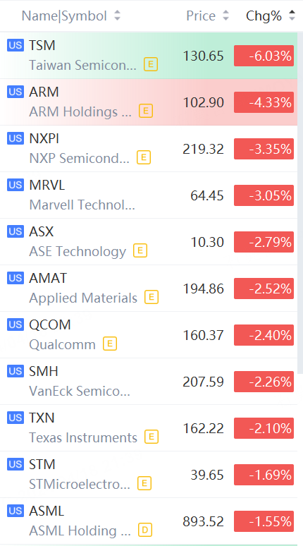 TSMC fell 6%; Arm fell over 4%; NXPI, Marvell fell over 3%; Applied Materials, Qualcomm fell over 2%.