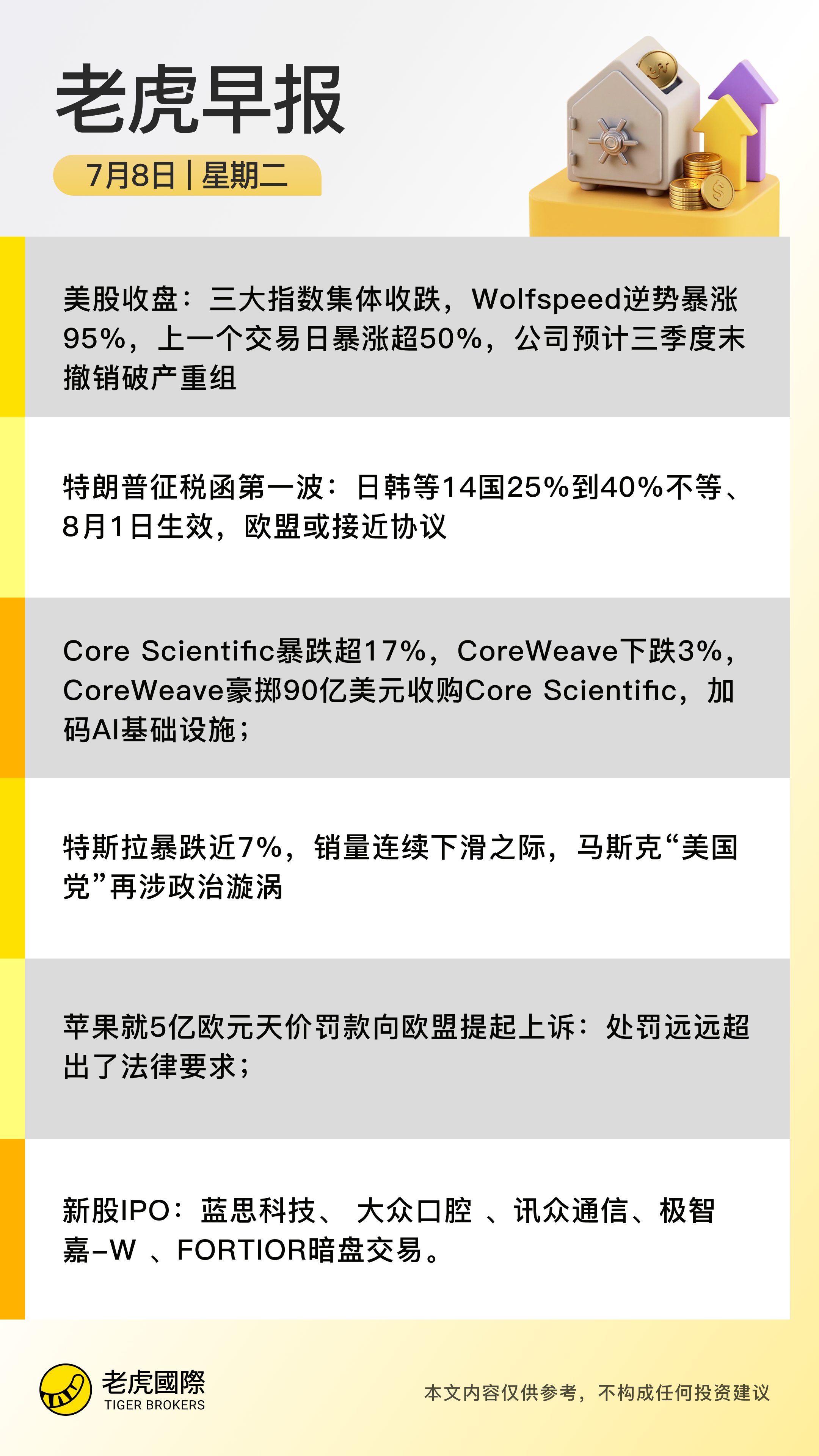 白宫推迟关税“大限”至8月1日,欧盟则接近达成初步协议,避免收到关税函,拟将美对欧关税锁定在10%并豁免飞机和酒类产品,以便后续谈判;此举导致三大美股指跌幅扩大,日元和韩元盘中跌超1%。