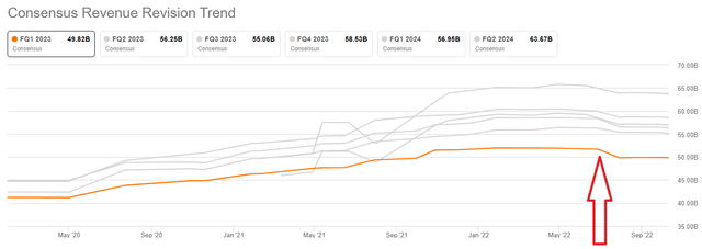 Here's what we see above. The red arrow points to the summer when indications that the inflation was more persistent than investors originally believed. And you can see that fiscal Q1 2023 (upcoming earnings) has been downwards revised, and that makes sense.