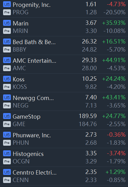 Some meme stocks slid in premarket trading. AMC, GameStop, Bed Bath & Beyond, Marin Software, Koss, Progenity and Phunware fell between 1% and 20%.