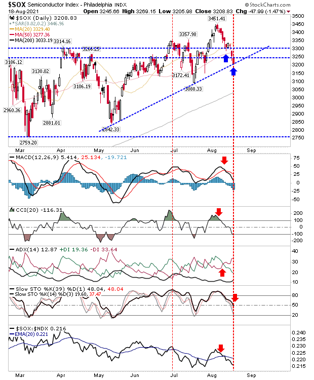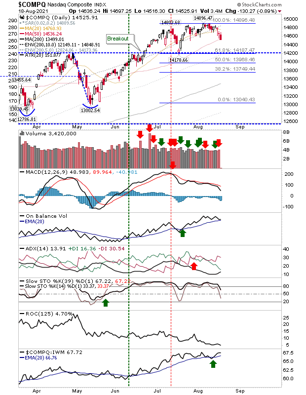 The NASDAQ took a loss to take it to its 50-day MA, but remains well above June breakout support. Look for an intraday spike below its 50-day MA but a close above as I would expect to see some form of positive test here.