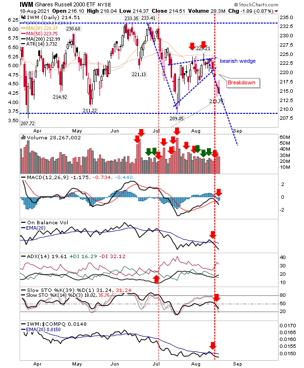 Wednesday's news was not the continued losses from the bearish wedge in the Russell 2000 as such losses have remained contained by the trading range. Before moving on, the Russell 2000 (via IWM) does have the 200-day MA to look for as a possible positive test despite the net bearish technical picture.