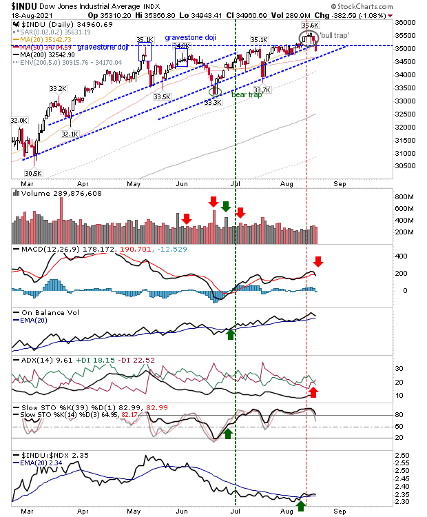 Despite this, it's not totally a goner. The index is outperforming the NASDAQ 100 and will soon be testing its 50-day MA. 'Bull traps' tend to be powerful topping patterns and if this evolves into something worse it will spell bad news for the S&P and probably the NASDAQ too.