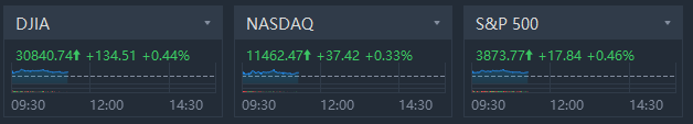 U.S. stocks remained high in morning trading; Nasdaq rose 0.33%, Dow Jones jumped 0.44% while S&P 500 gained 0.46%.