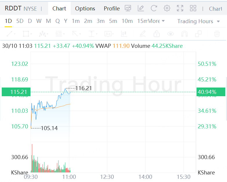 Reddit's shares were up more than 40% on Wednesday after it reported robust growth in revenue and daily active users, with the latter surging to nearly 100 million during the third quarter.