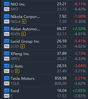 EV stocks tumbled in premarket trading, with NIO falling over 6% and Rivian falling nearly 5%.