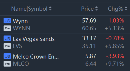 Some casino stocks jumped in premarket trading. Wynn, Las Vegas Sands and Melco Crown rose between 5% and 9%.