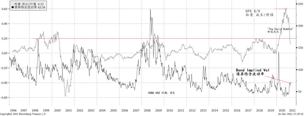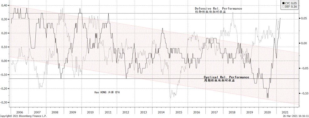 全球经济正在复苏。由于中国出口已成为之前停摆了的美国经济更为重要的输入,中美经济周期比以往任何时候都更加紧密地交织在一起。大宗商品的强势预示着中国未来几个月上游通胀的压力,很可能会反映在美国债券收益率和波动性的上升。成长型股票是长久期资产,因此对收益率和波动性的上升非常敏感。简单地说,不断上升的收益率压低了增长倍数,而不断加剧的波动性则让人们更急于从成长型股票的显著收益中获利了结。资金应继续轮动到相对安全的价值股。