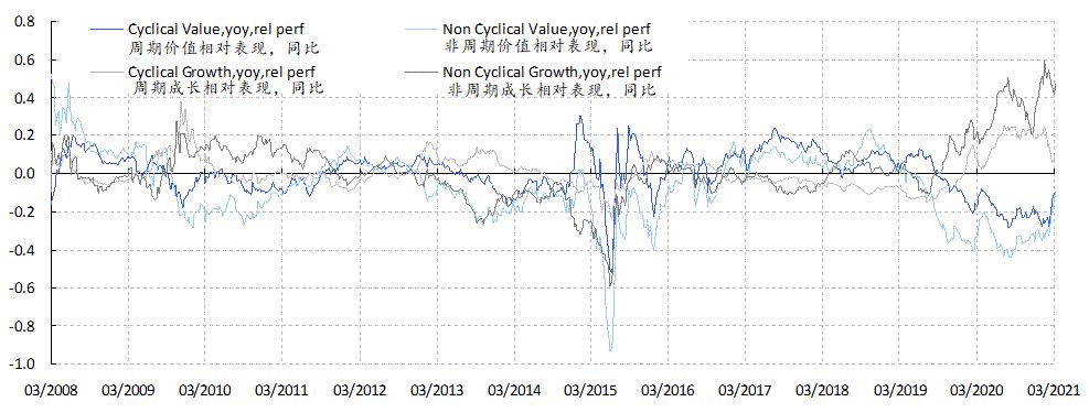 我们可以进一步将价值和成长分为周期性价值/成长和非周期性价值/成长。我们可以发现,尽管周期性成长和非周期性成长已经跑赢,但是它们的强势正在衰退。与此同时,周期性价值和非周期性价值正在从往日的颓势中逐渐修复(图表7)。这些观察结果与前文的图表5和图表6一致。