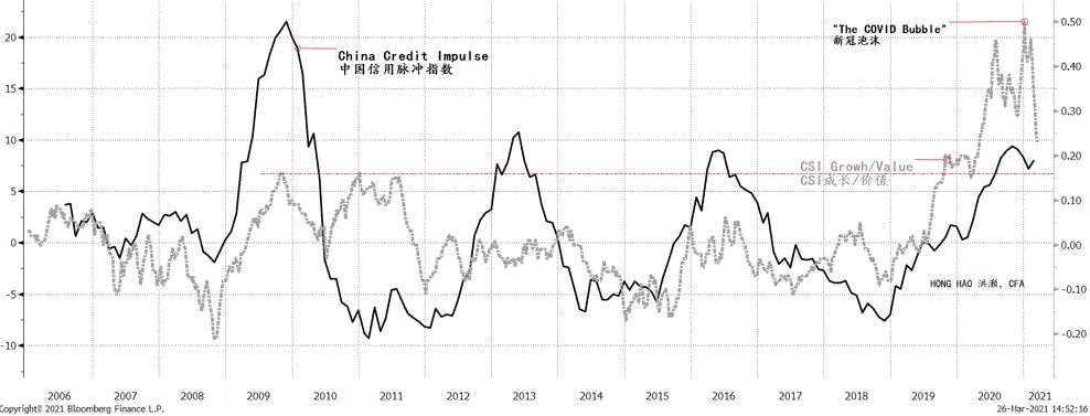 图表 4: 信贷扩张推升成长对价值的相对强势到了一个前所未有的高度