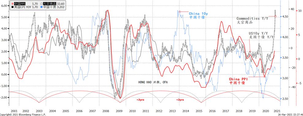 正如我们在上面的图表中展示的中国PPI周期、大宗商品强势与美国十年期国债收益率之间的关系,中国PPI在近期很可能会进一步走高。与此同时,美国十年期国债收益率也会同步上升。因此,美国债券的波动性在未来几个月很可能会加剧。