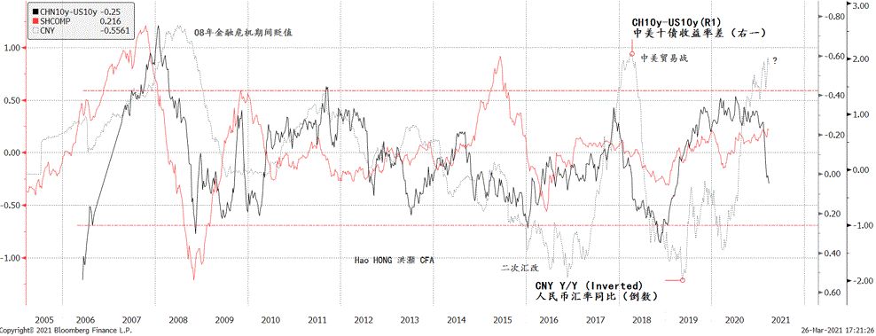 中美经济周期的联动将持续,关键的经济变量也将继续高度相关。我们认为,鉴于两国对疫情截然不同的管理方式,中国出口已然成为对美国经济更加重要的输入力量。因此,这两个最大的经济体的经济周期现在必然更加紧密地交织在一起。因此,中国的通胀前景将继续对美国国债收益率产生显著的影响;而长期以来一直是全球无风险基准利率的美国国债收益率,也将反过来影响着中国的股市。事实上,我们可以从下面的图表中看到这些经济变量是如何紧密的联系在一起。(图表3)