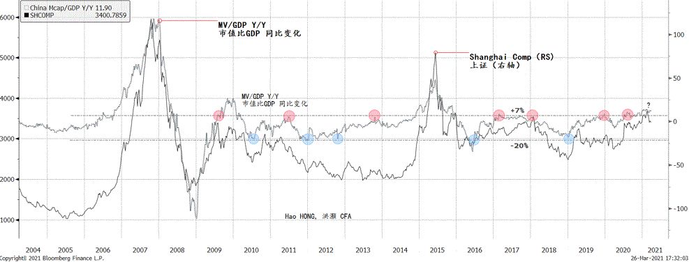 尽管如此,地缘政治风险也在上升。最近的高层对话里,双方锋芒相对,并实施了新的制裁。这些风险将在短期内拖累市场。在中国经济继续修复时,中国的存准率不太可能大幅降低。而中国的信贷扩张受到房地产泡沫的牵制将开始放缓。从历史上看,人民币走软与经济和经济、地缘政治风险大体同步,就像2008年和2018年那样。以市值与GDP之比衡量的估值的变化表明,指数涨幅受限。因此,我们继续认为,机会更多在于价值板块的轮动,而不是整体绝对指数水平。当然,我们也必须强调,中国长期的投资价值,并不是短期里的债券、汇率、大宗商品和股市的价格波动可以表达的。
