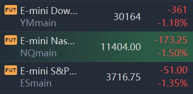 At 07:50 a.m. ET, Dow e-minis were down 361 points, or 1.18%, S&P 500 e-minis were down 51 points, or 1.35%, and Nasdaq 100 e-minis were down 173.25 points, or 1.5%.