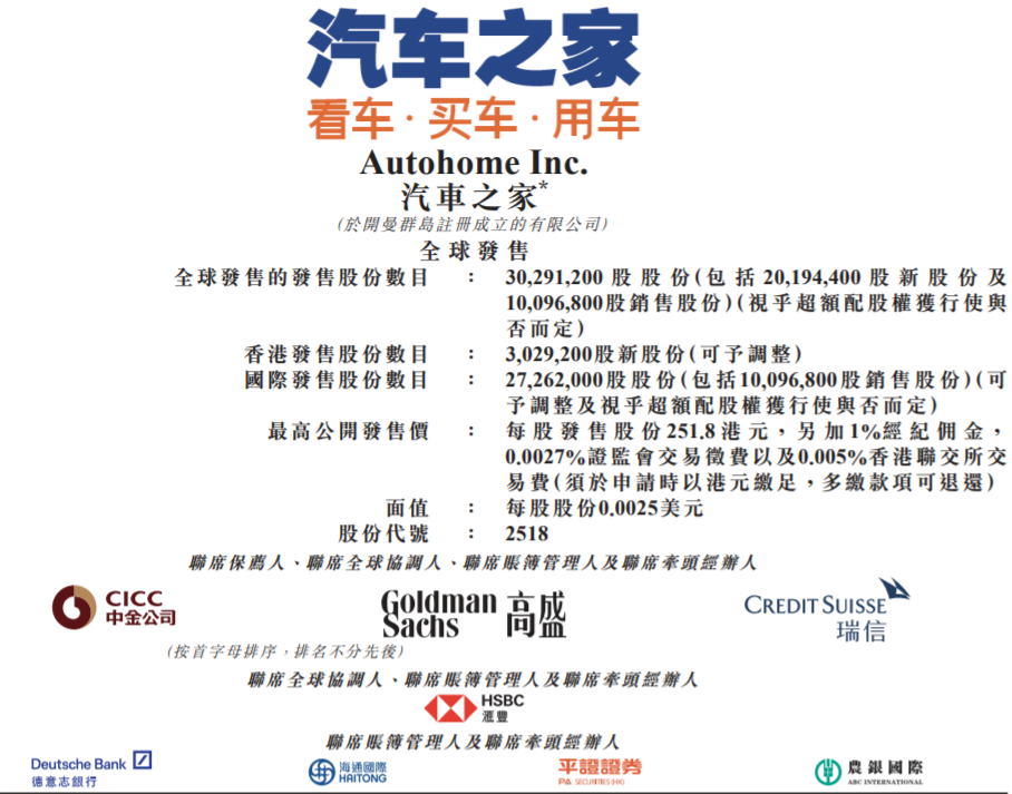 3月4日,汽车之家-S发布公告,公司拟全球发售3029.12万股股份,其中香港发售股份302.92万股,国际发售股份2726.2万股;2021年3月4日至3月9日招股,预期定价日为3月9日;公开发售价将不超过每股香港发售股份251.8港元,每手买卖单位100股,入场费约25433.74港元;中金公司、高盛及瑞信为联席保荐人,预期股份将于2021年3月15日于联交所主板挂牌上市。