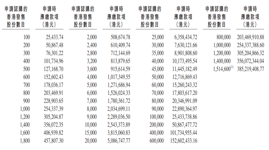 乙组门槛为20000股,申购所需资金约5086747.77港元。