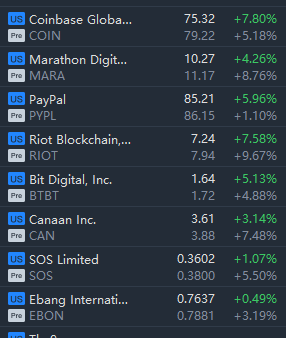 Crypto stocks jumped in premarket trading, with Marathon rising over 8% and Riot rising near 10%.