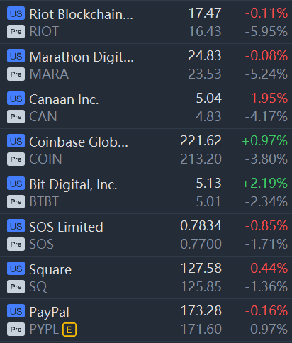 Blockchain stocks dropped in premarket trading as Bitcoin Tumbles Below $40,000 to Lowest Level in Five Months.