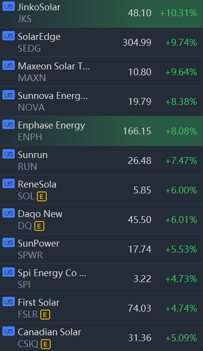 Solar stocks jumped in morning trading.Jinko Solar, SolarEdge, Maxeon Solar Technologies, Sunnova Energy International, Enphase Energy, SunRun, ReneSola, Daqo New Energy, SunPower, SPI Energy, First Solar, Canadian Solar and Hannon Armstrong climbed between 4% and 10%.