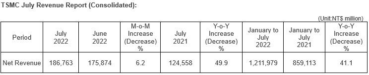 TSMC today announced its net revenue for July 2022: On a consolidated basis, revenue for July 2022 was approximately NT$186.76 billion, an increase of 6.2 percent from June 2022 and an increase of 49.9 percent from July 2021. Revenue for January through July 2022 totaled NT$1,211.98 billion, an increase of 41.1 percent compared to the same period in 2021.