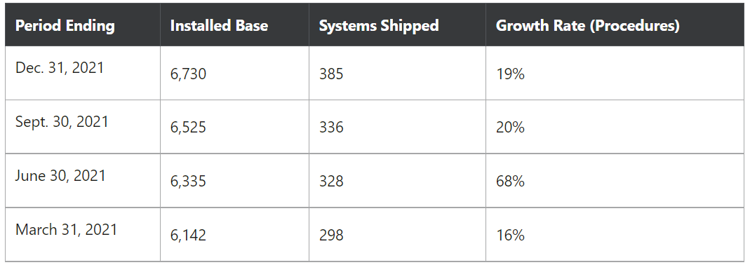 The company has been doing a good job of steadily growing its installed base. In the second quarter (ended June 30, 2021), the high year-over-year increase in procedures was due to a resumption of more normal hospital activities (vs. a year earlier when lockdowns were in place during the early stages of the pandemic).