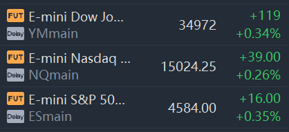 At 07:55 a.m. ET, Dow e-minis were up 119 points, or 0.34%, S&P 500 e-minis were up 16 points, or 0.35%, and Nasdaq 100 e-minis were up 39 points, or 0.26%.