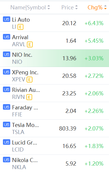 Tesla, Rivian, Lucid, NIO, Xpeng, Li Auto, Arrival, Nikola, and Canoo rose between 1% and 7%.