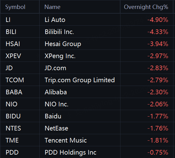 Chinese ADRs dropped in overnight trading. Li Auto fell 5%; Bilibili and Hesai fell 4%; XPeng, JD.com, and Trip.com fell 3%; Alibaba, NIO, Tencent Music, Baidu, and NetEase fell 2%.