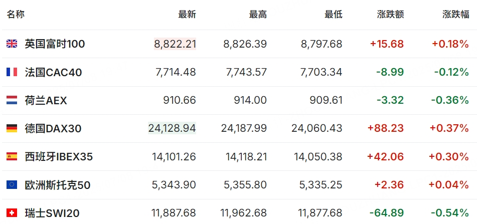 欧洲主要股指涨跌不一,截至发稿,英国富时100涨0.18%,法国CAC40跌0.12%,德国DAX30指数涨0.37%。