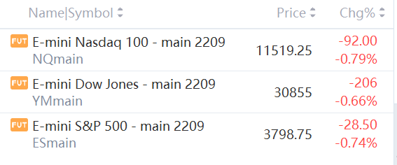 S&P 500 futures fell 0.74%; Futures on the Nasdaq 100 fell 0.79%; Futures on the Dow Jones Industrial Average fell 0.66%.