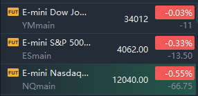 At 7:50 a.m. ET, Dow e-minis were down 11 points, or 0.03%, S&P 500 e-minis were down 13.5 points, or 0.33%, and Nasdaq 100 e-minis were down 66.75 points, or 0.55%.