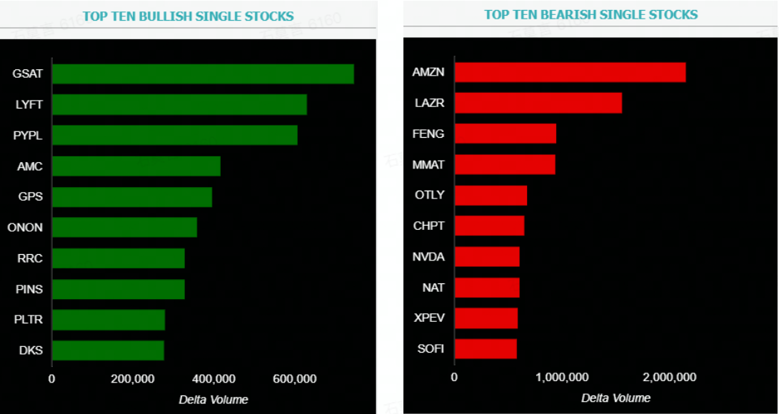 This report shows stocks with the highest volume of bullish and bearish activity by option delta volume, which converts option volume to an equivalent stock volume (bought or sold).