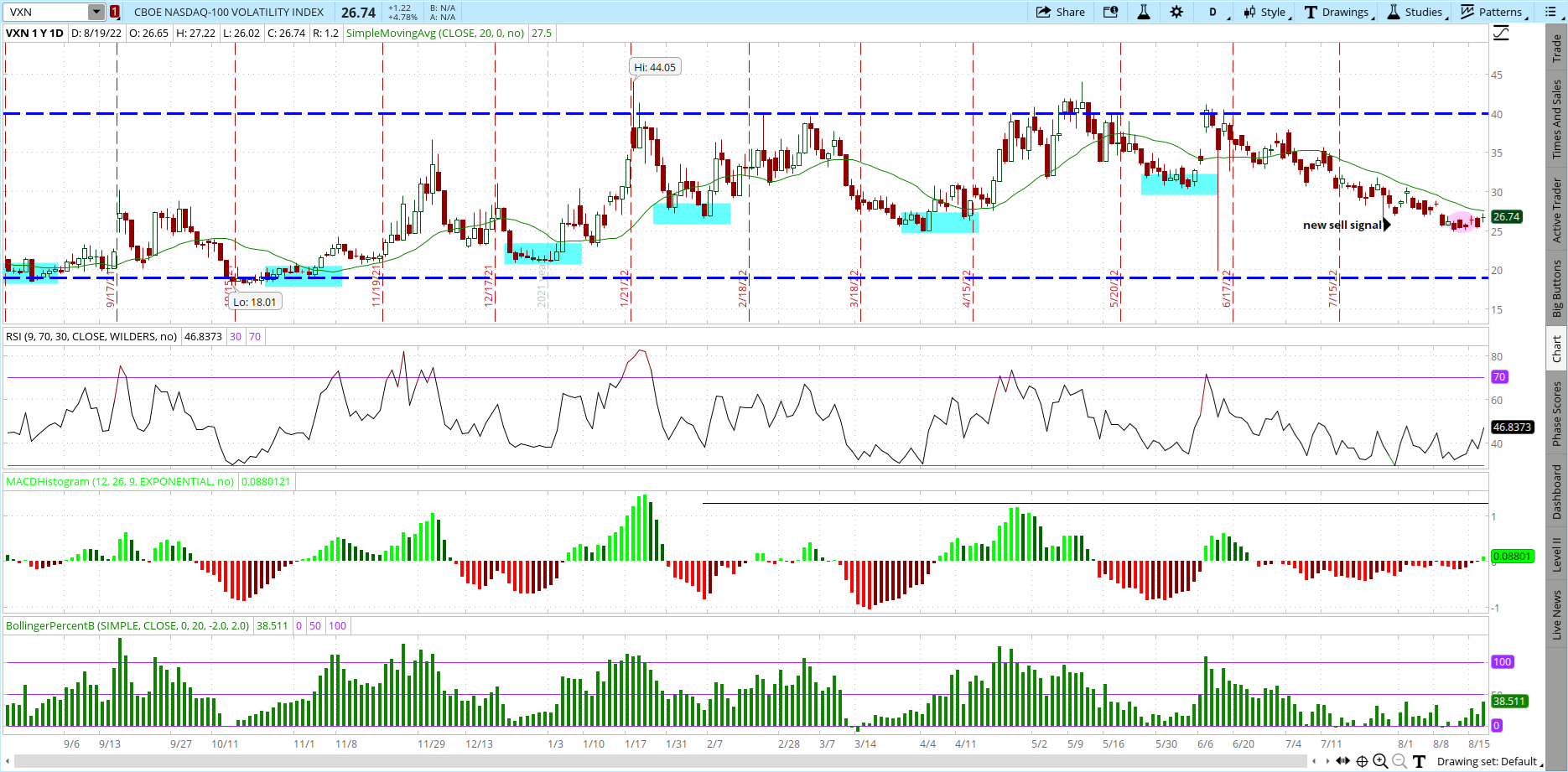 VXN sell signals are generated when VXN makes at least a 33% pullback from the previous high and then makes a reversal off the lows. Over the past 12 months there have been 6 such sell signals generated (highlighted in aqua on the chart below)