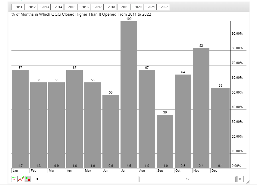 Over the past twelve years September has been the only down month for QQQ. Shares have shown gains less than half the time with an average loss of 1%. Every other month is positive on both performance and number of up months versus down months.