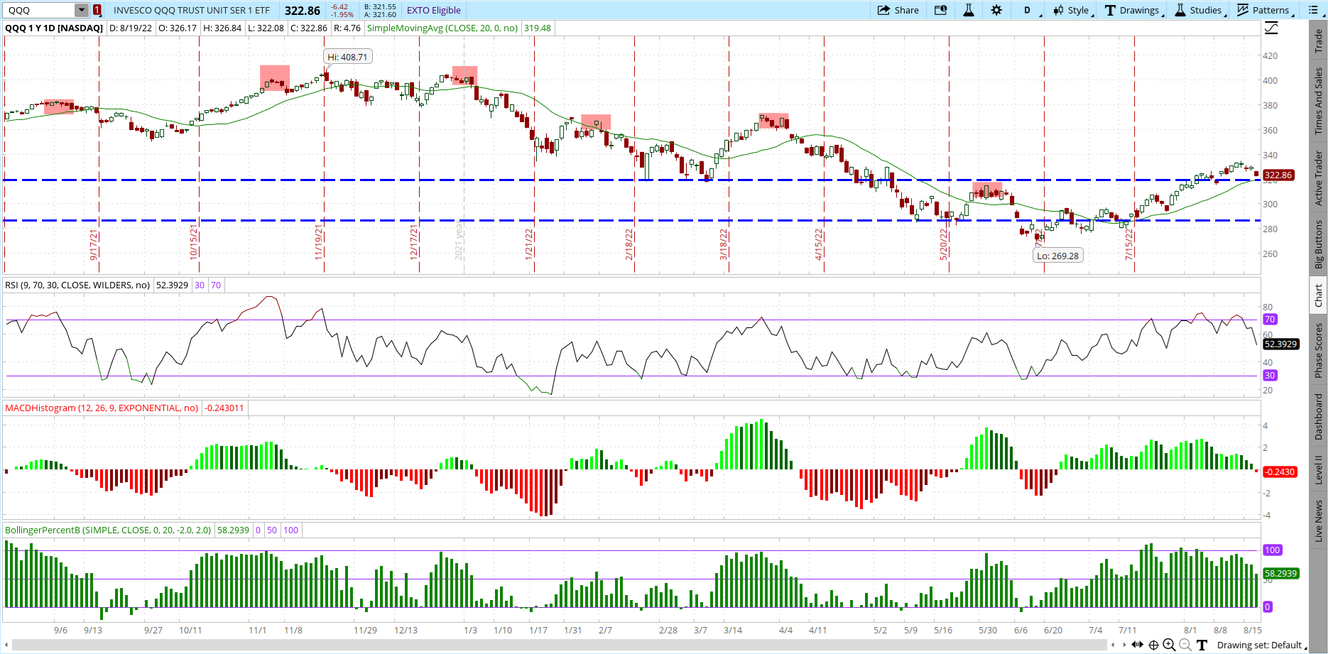 So, traders looking to take a short position for the short-term would be best served buying puts versus shorting QQQ outright. Limited risk with potentially explosive returns. Plus an increase in implied volatility generally will be a benefit to the long put position as well.
