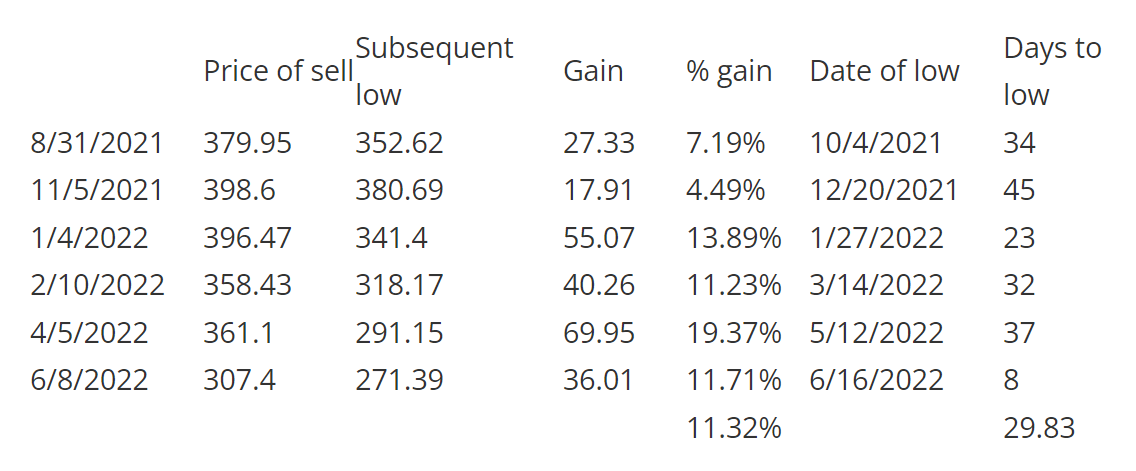 I put together a quick snapshot summary of the VXN based sell signal methodology over the past year shown in the table below.